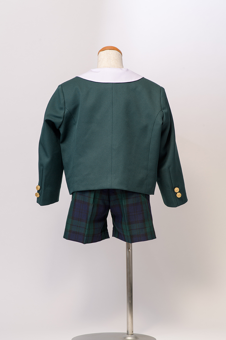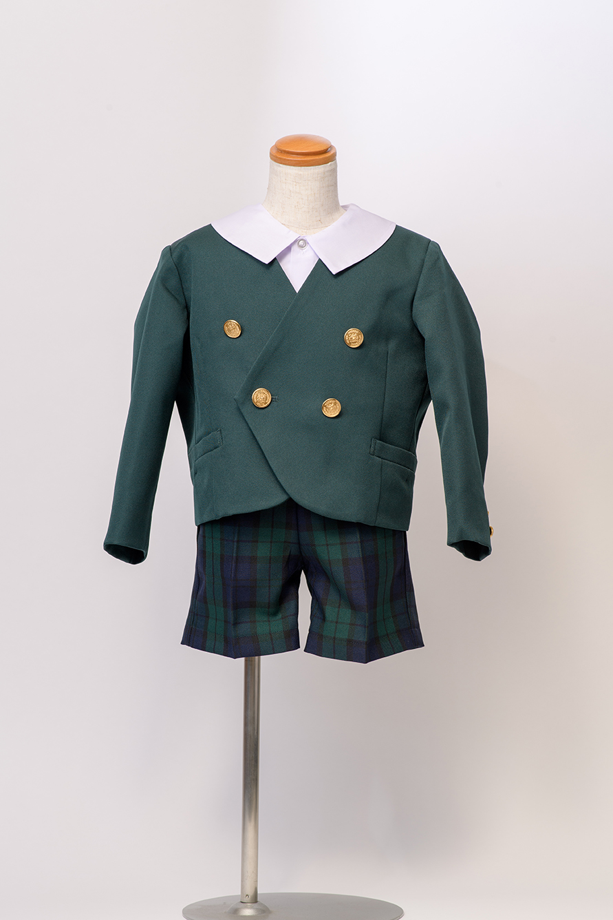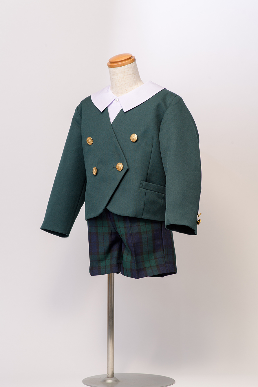 半ズボンは、グリーンチェック柄でしっかりとした生地。ポリエステル100%なので、洗濯時の痛みも気になりません。