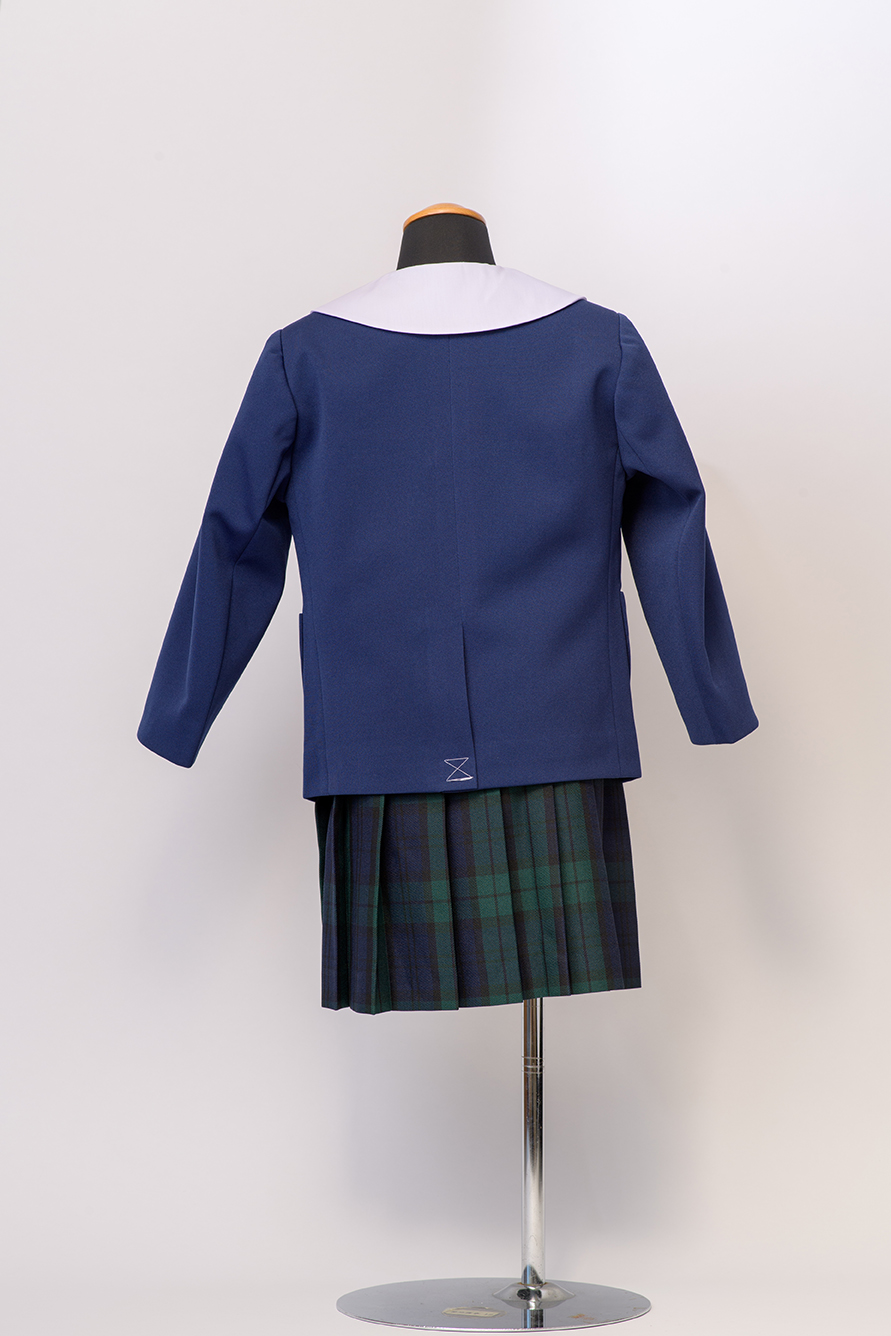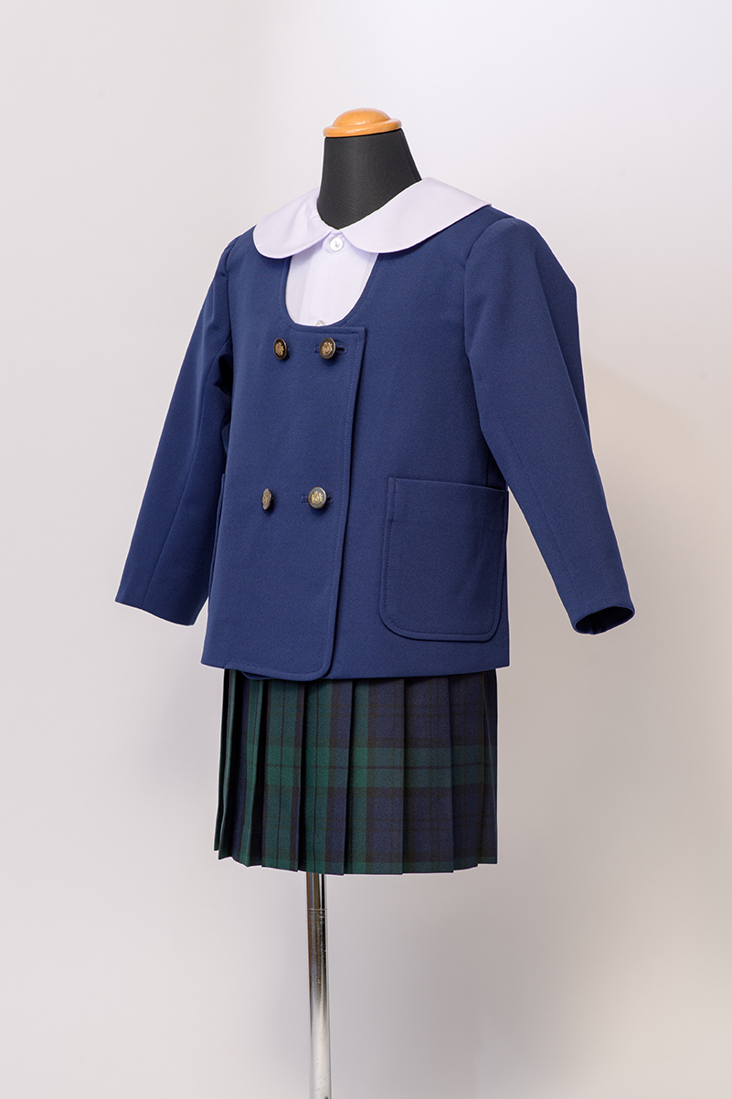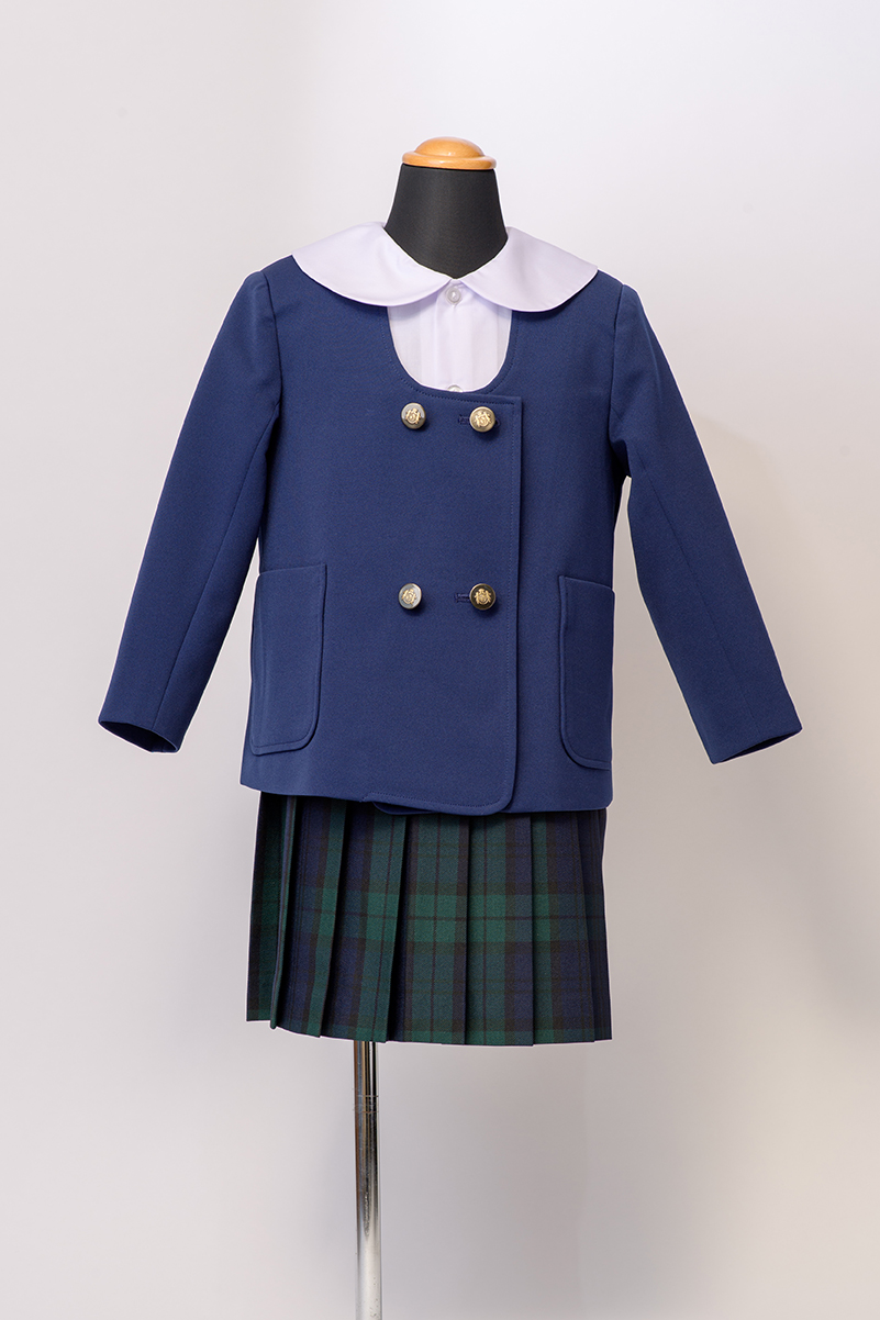 丸首が特徴で、落ち着いた丈の長さのジャケット。通常のブルーよりも明るい印象のブルーカラで、お子様の笑顔を引き立たせます。
