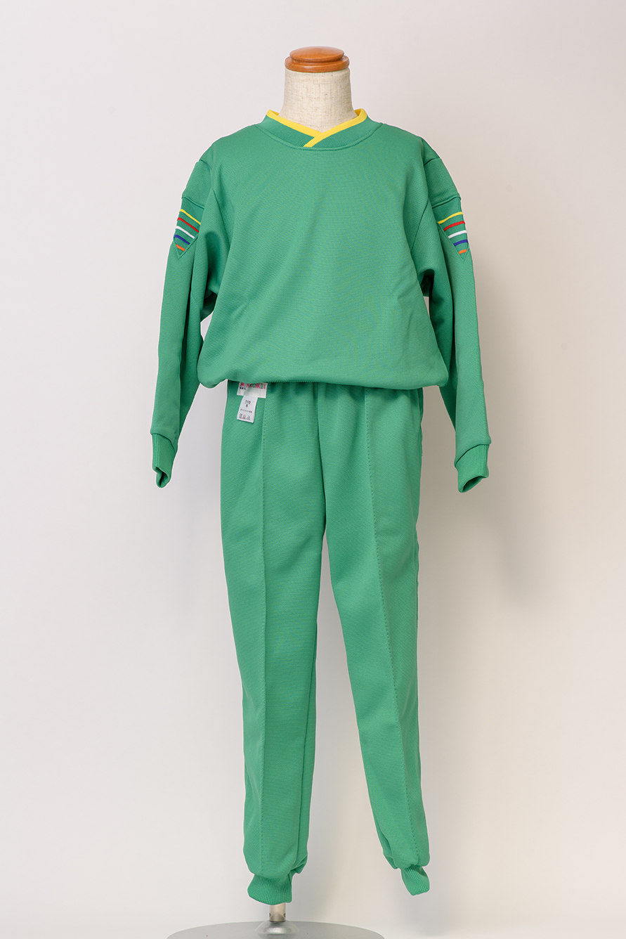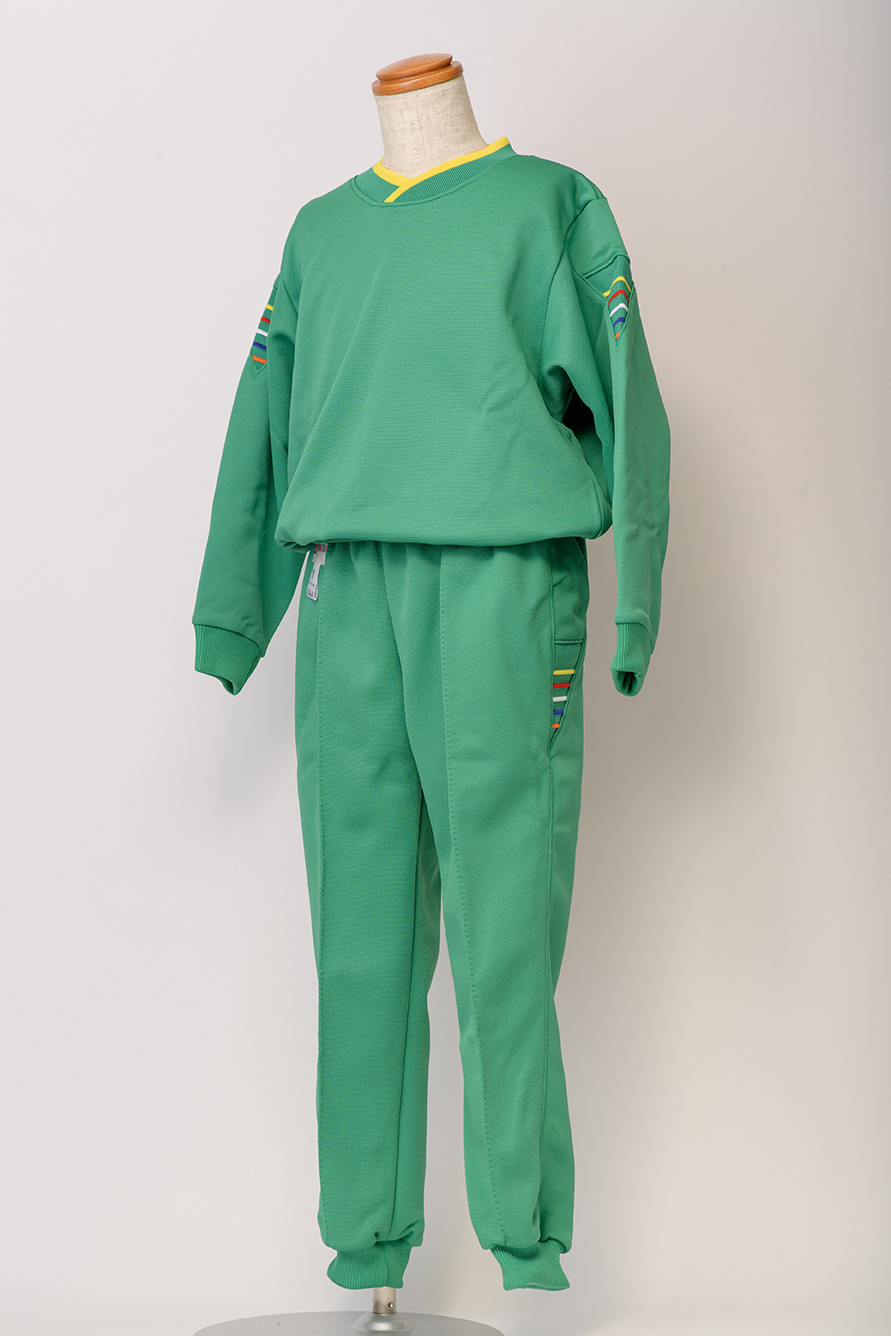 掲載のグリーン生地のほかにも、オレンジ/ブルーのバリエーションがございます。腕部分と、長ズボン両サイドにある5本のカラフルなラインが特徴の、デザイン性の高い人気の体操着です。